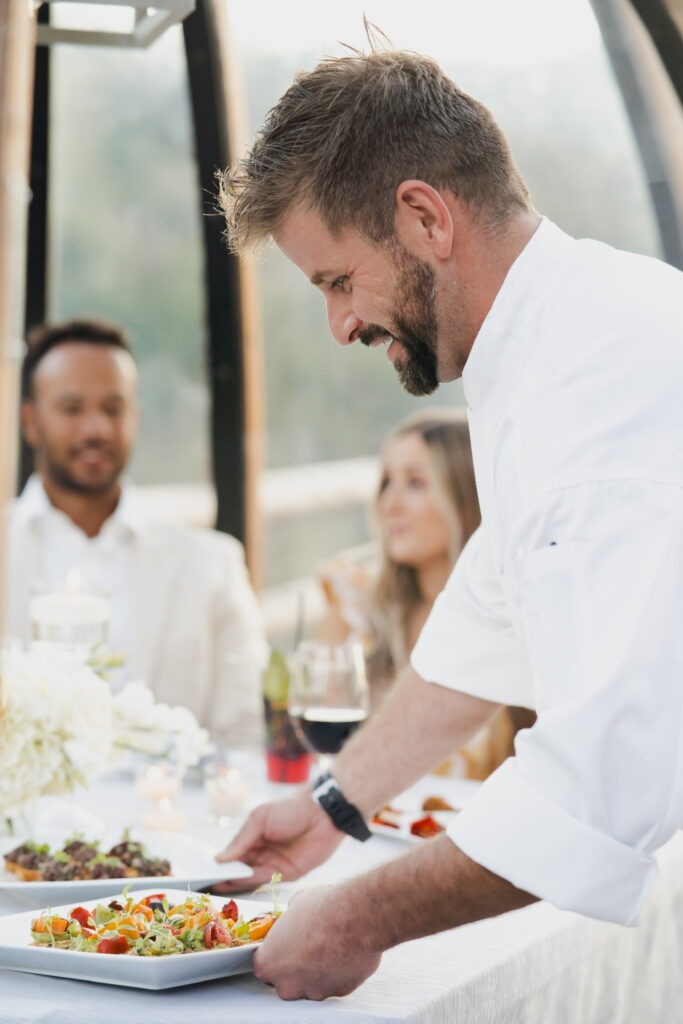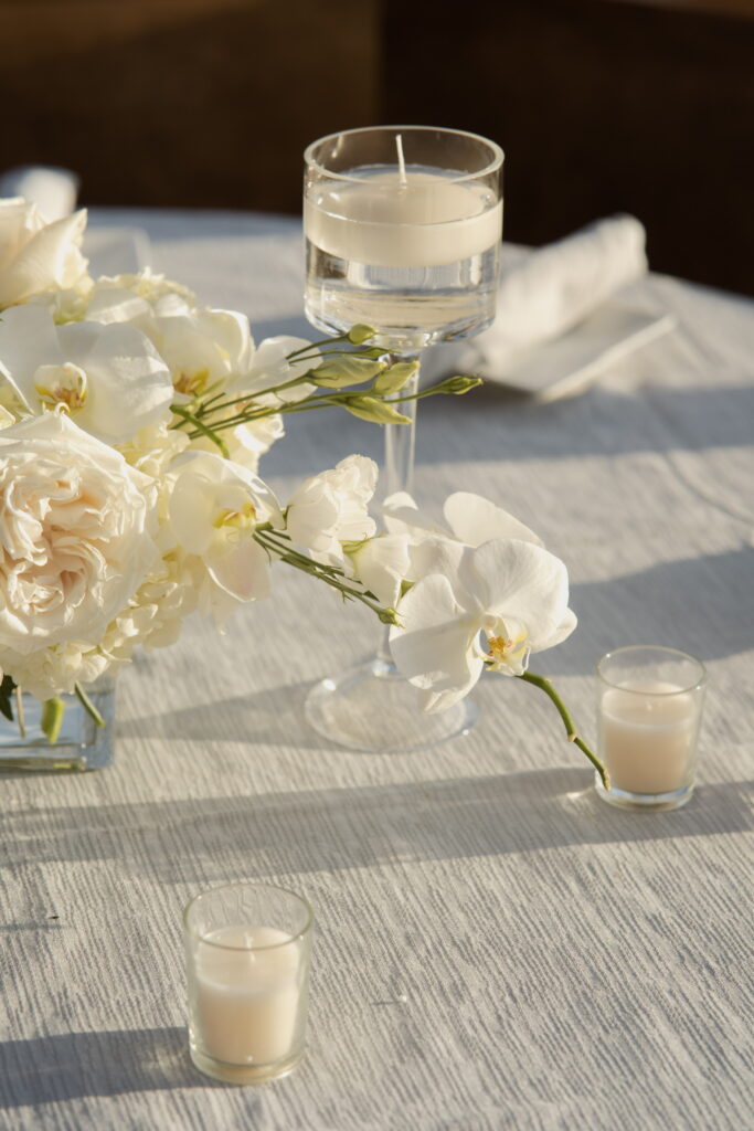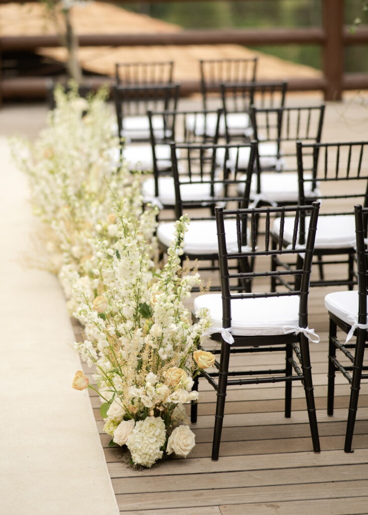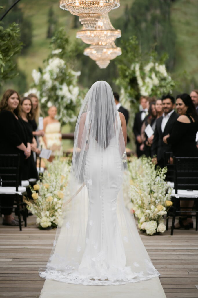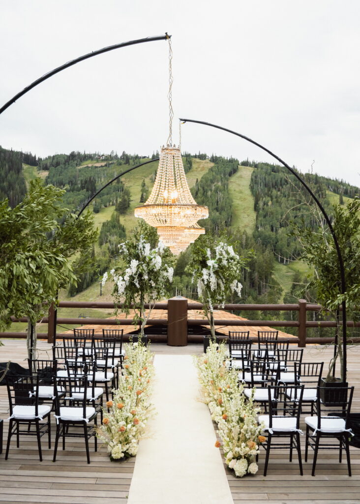 The florals had to aesthetically capture the benchmarks of our design, the natural mountainside backdrop as well as the chic evolved elegance of Chanel. The aisle was adorned with continuous rows of white flowers accented by touches of golden yellow. Refined chandeliers created a luminescent canopy overhead. Aspen trees frosted with white blossoms framed the bride and groom.